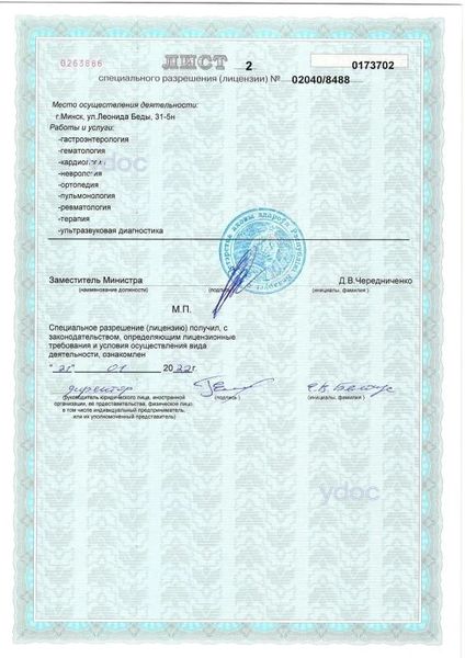В филиале на Леонида Беды доступны следующие виды услуг для взрослых и детей: ультразвуковые исследования взрослым и детям с рождения, прием врачей-специалистов следующих медицинских направлений: неврология (прием взрослых и детей), кардиология, ортопедия (взрослый и детский прием), гастроэнтерология, ревматология, терапия, гематология, пульмонология, пункции, лечебные блокады.