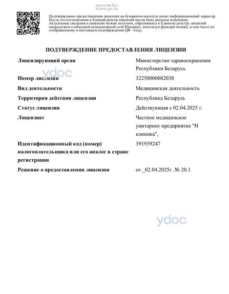 «Н Клиника» в Витебске предоставляет медицинские услуги по основным направлениям: гинекологии, дерматологии, кардиологии, а также инструментальной и функциональной диагностике. В штате работают специалисты с профильным образованием — акушер-гинеколог, дерматовенеролог, кардиолог, врачи ультразвуковой и функциональной диагностики. Клиника оснащена современным оборудованием, позволяющим проводить точные исследования. Диагностика и лечение строятся на стандартных медицинских протоколах с учётом индивидуальных особенностей пациента. Деятельность ведётся на основании лицензии, соблюдаются требования к санитарному контролю. Приём пациентов проходит в будни с 9:00 до 21:00 и в субботу с 9:00 до 18:00. Предусмотрена предварительная запись для сокращения времени ожидания.
